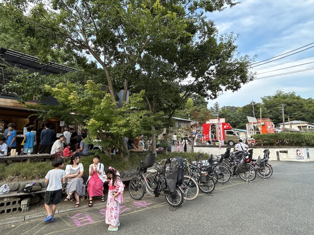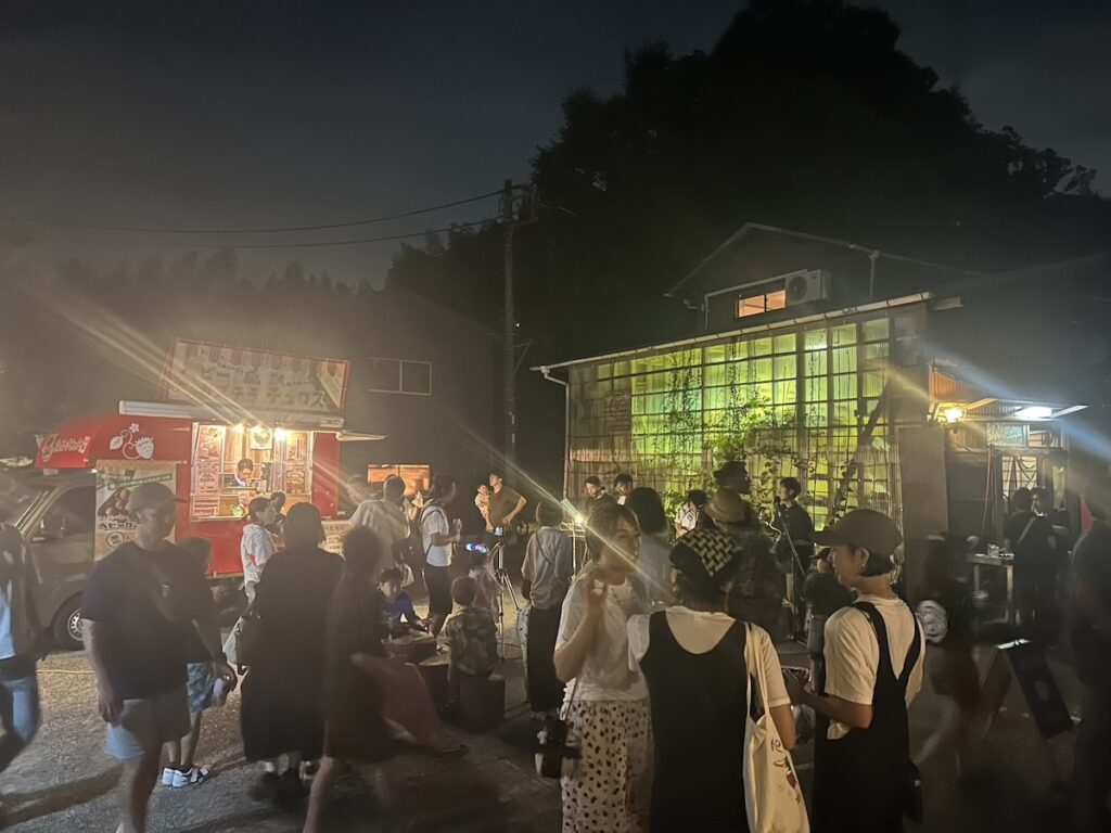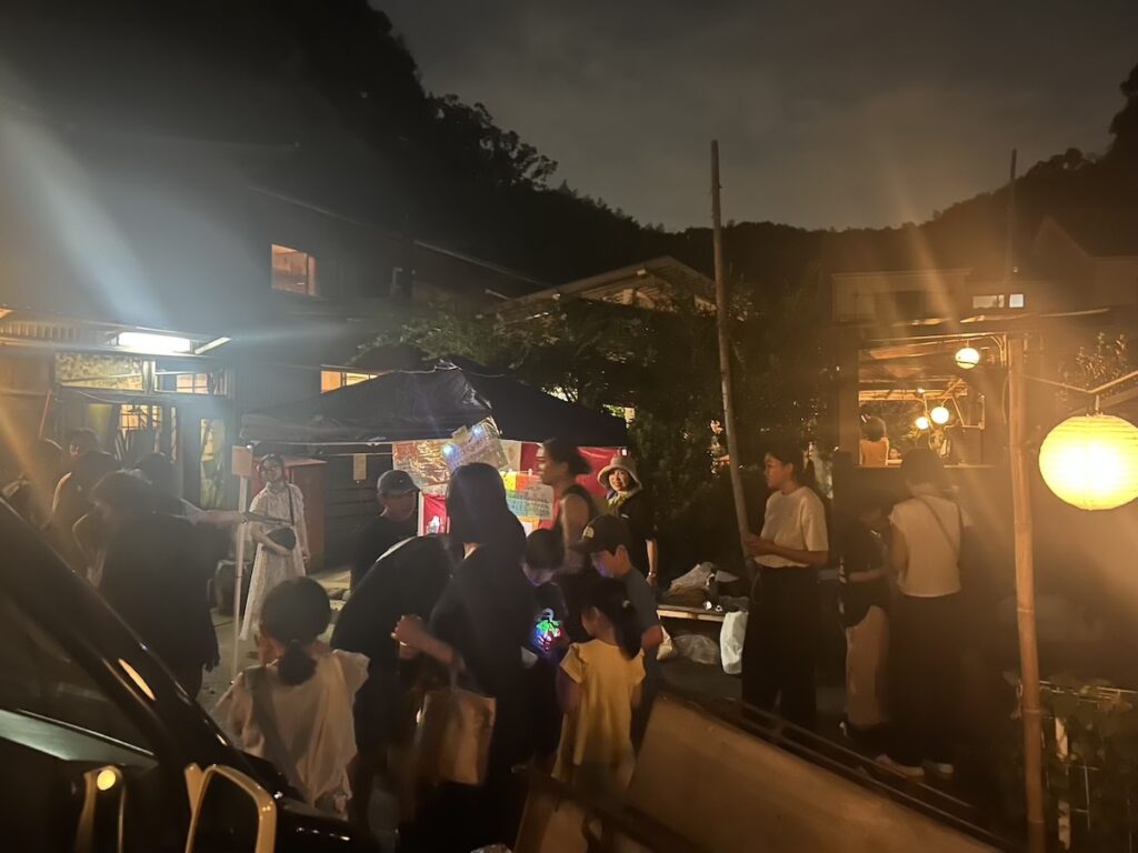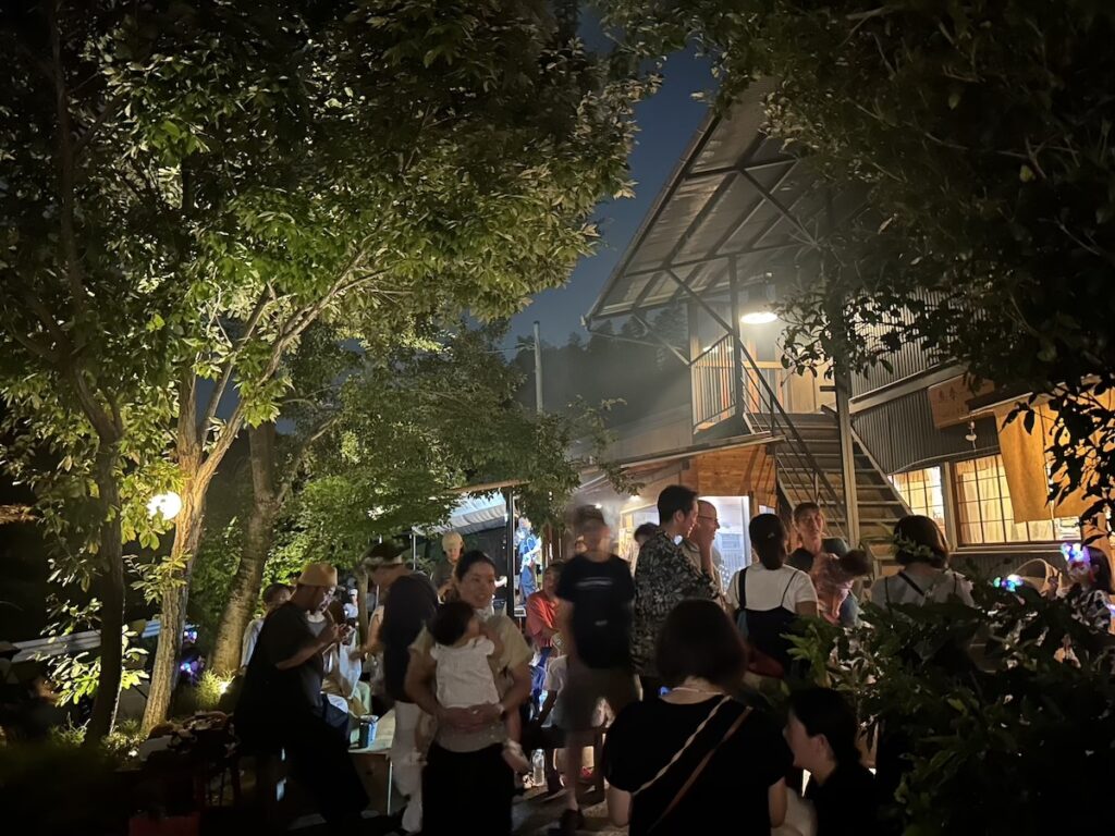 ◯今年も里山ナイトが開催。道の向こうの竹林に夕日があたる頃 たくさんのお客様が夏まつりにお越し下さいました。