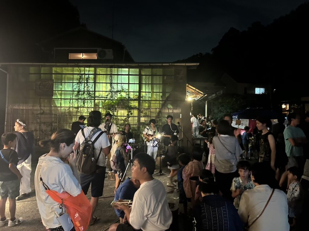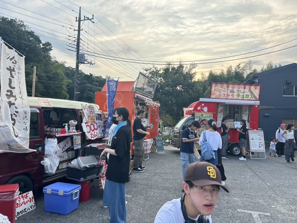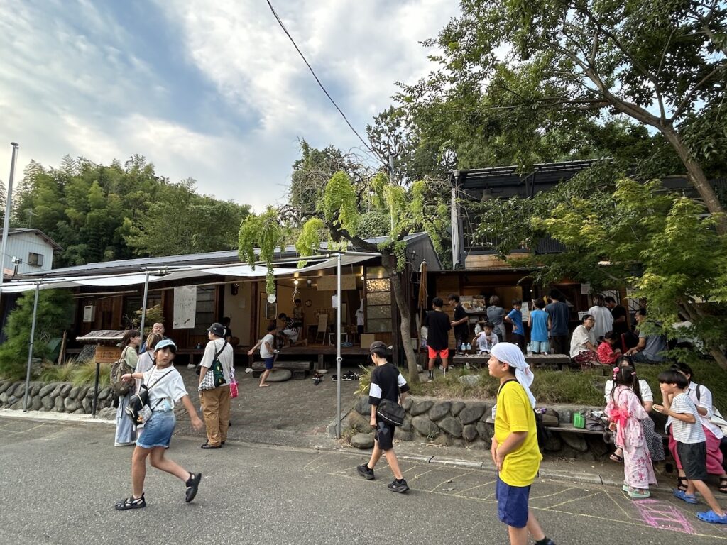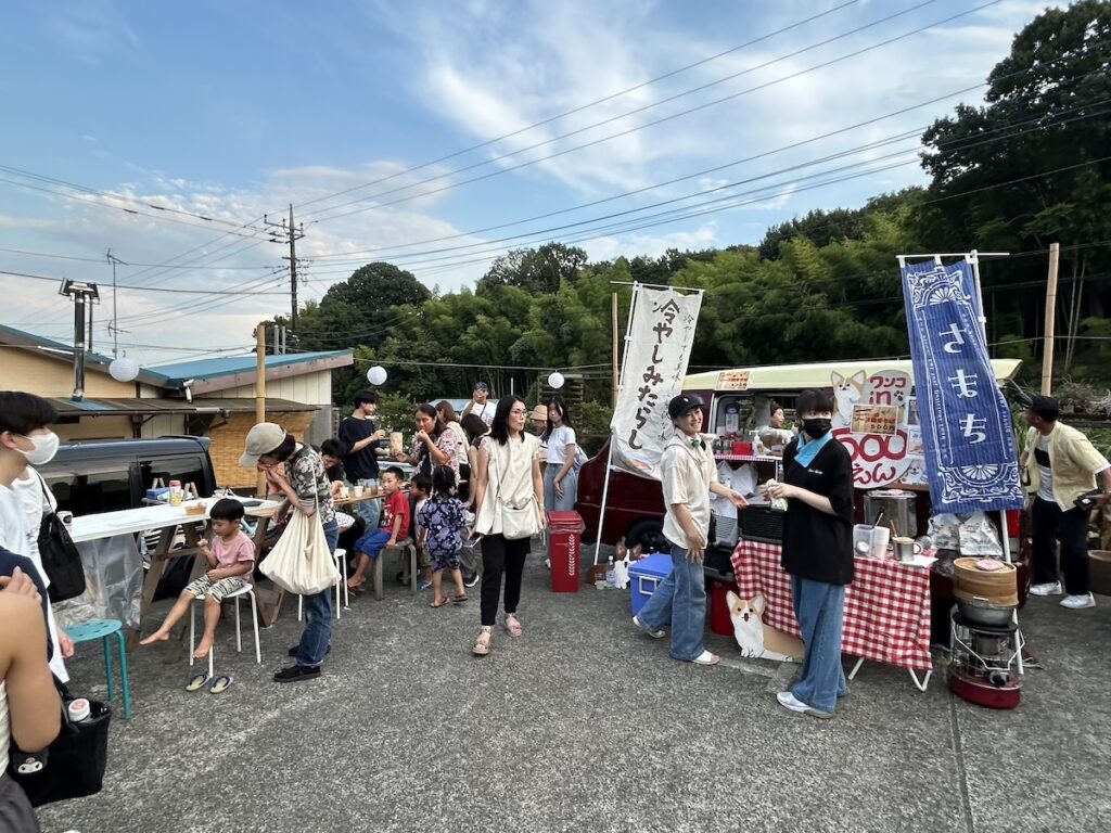 ◯今年も里山ナイトが開催。道の向こうの竹林に夕日があたる頃 たくさんのお客様が夏まつりにお越し下さいました。