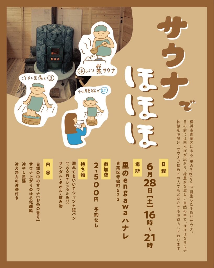 ほほほ湯初のサウナイベント♨️どんな人でもサウナを好きになってもらえるようなほほほな体験をお届け🌿 横浜市青葉区にある「里のengawa」で誕生した手作りのサウナ。目の前は田んぼが広がり、緑豊かな自然の中で、6月の涼しい夜のサウナはきっと格別です😚 サウナがはじめての人も、どんな人でもおまちしてます🦭心も身体もじんわりほほほになりましょ〜 サウナほほほプラン🌿🍵✳︎サウナ✳︎ほはほ似顔絵✳︎ひやし足湯✳︎サウナあがりの冷茶付 —————————————————————————