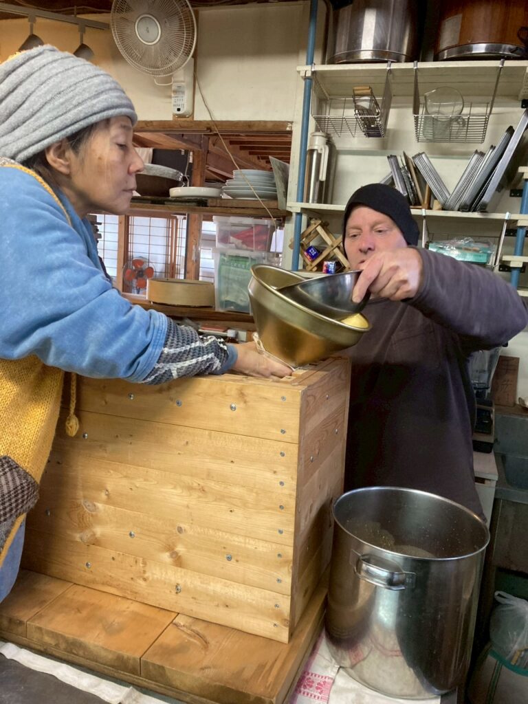 醤油を絞る機械は、アレックスの手作り。丁寧に洗って準備します。