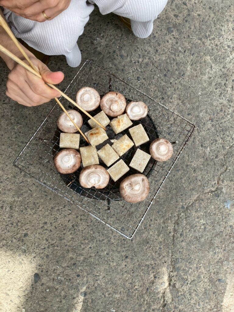 お餅やしいたけは七輪を出してもらって焼いて…、